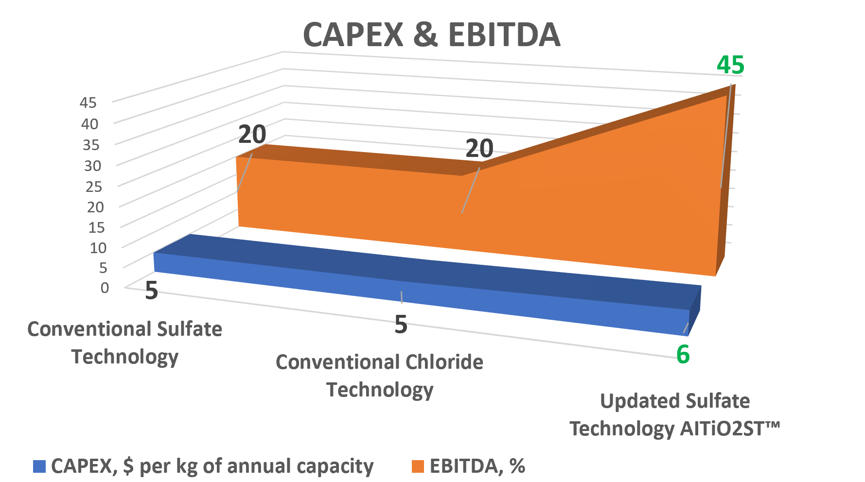 In comparison with construction of conventional sulfate or chloride titanium dioxide plant, construction of a new plant using AITiO2ST™ technology allows for a relatively small increase in CAPEX (by 20%) to obtain a significant increase of EBITDA (on 125%).